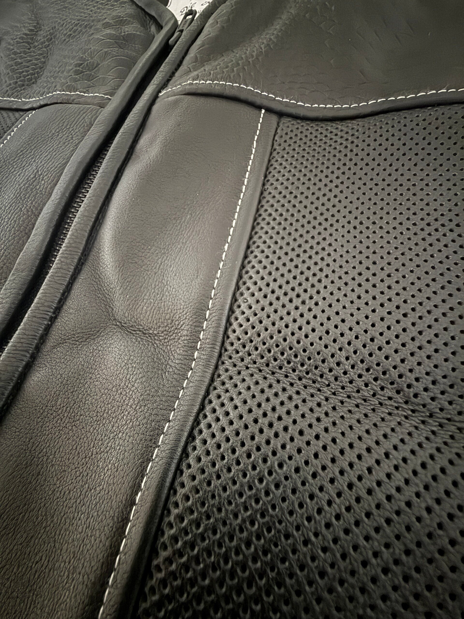 Teile der Front- und der Rückenflächen bestehen aus gelochtem Rindsleder, das nicht nur optisch überzeugt, sondern auch für verbesserte Belüftung sorgt – ideal für warme Rideouts und lange Touren.